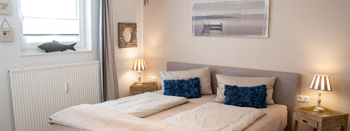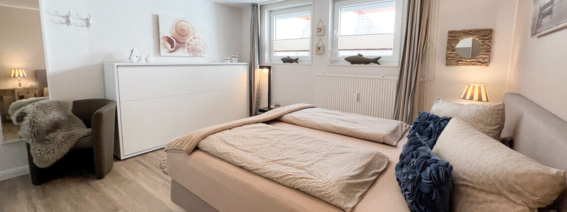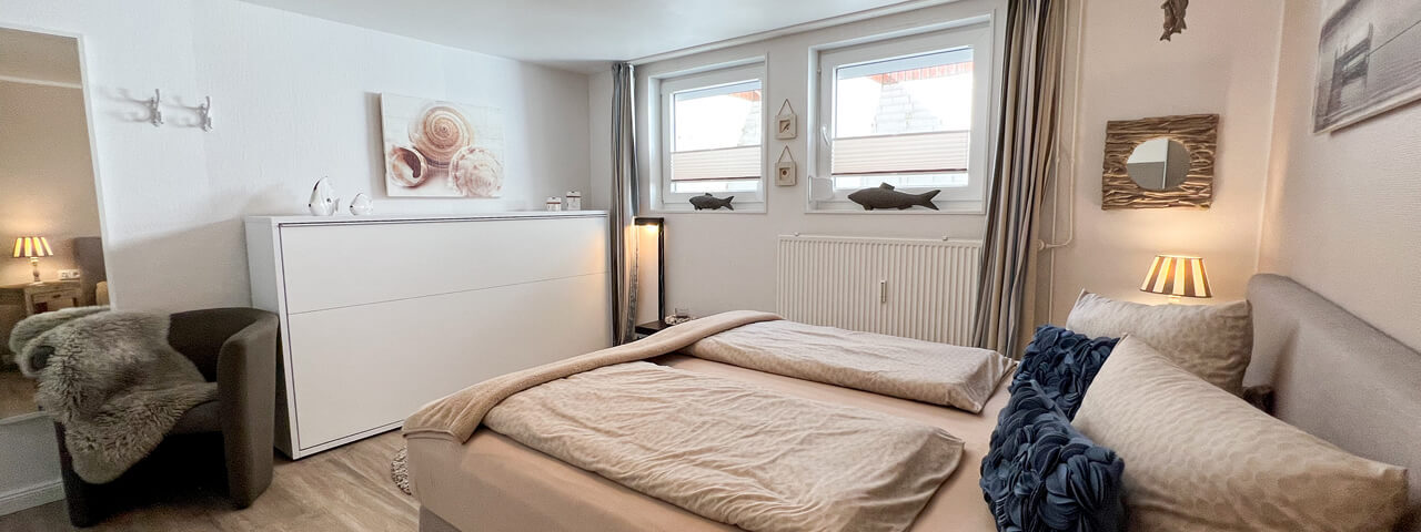 Das Schlafzimmer ist ausgestattet mit einem Boxspringbett 1,80m x 2,00m, einem hochwertigen Querschläfer 0,90m x 2,00m und einer Sitzgelegenheit.