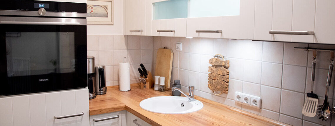 Die moderne Küche bietet Induktionskochfeld, Mikrowelle mit integriertem Backofen, Spülmaschine und Kaffeemaschine. Von dort gelangt man über eine Treppe in den Flur des Souterrains. Links ist das Badezimmer mit Dusche, rechts das geräumige Schlafzimmer mit zwei Fenstern.